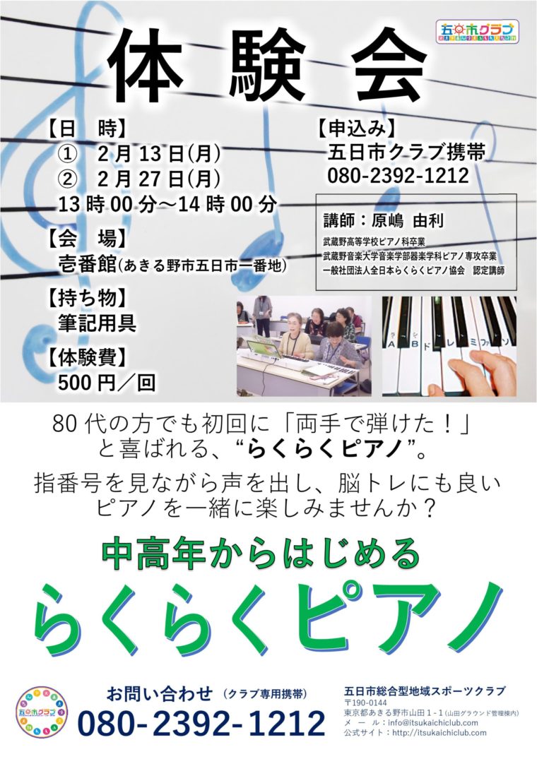2月13日(月)と2月27日(月)の13時~14時で《中高年から始めるらくらくピアノ》の体験会を行います。