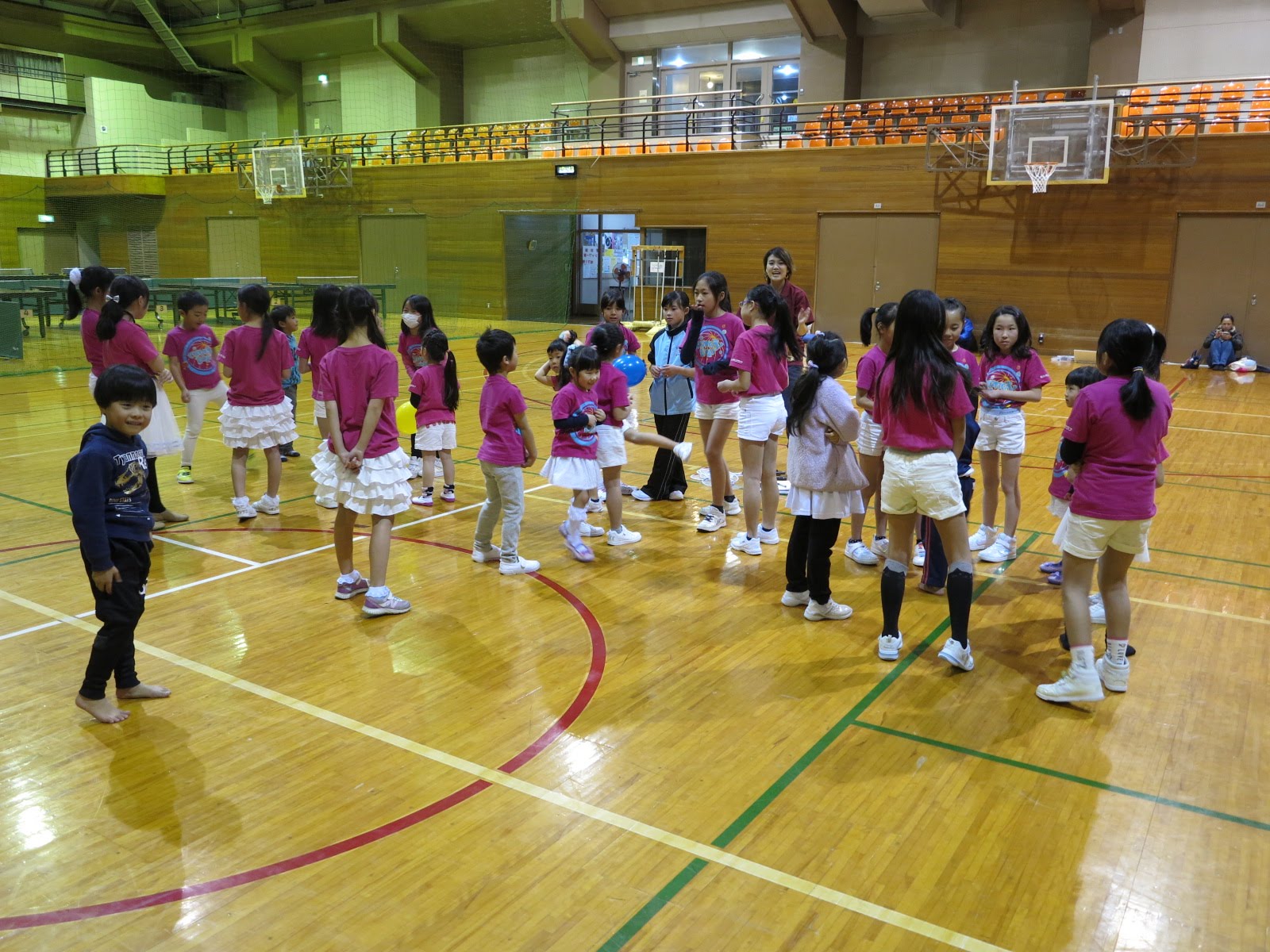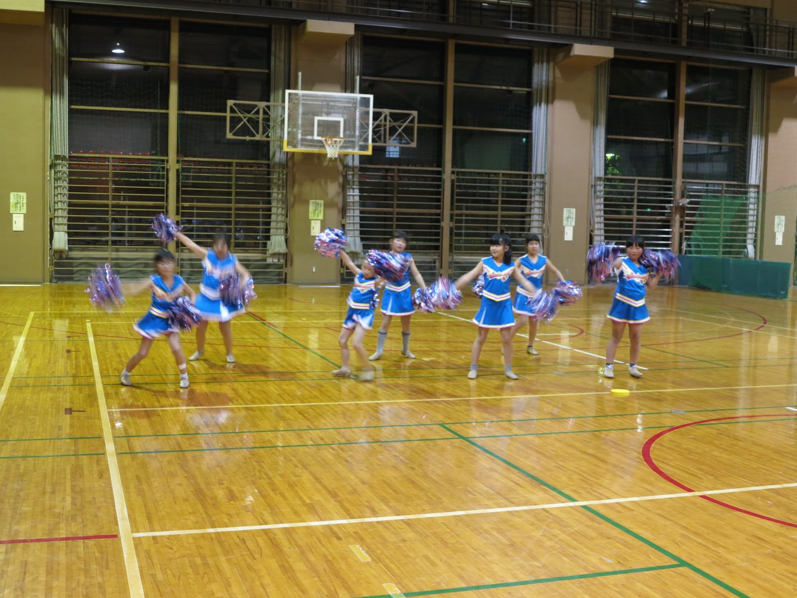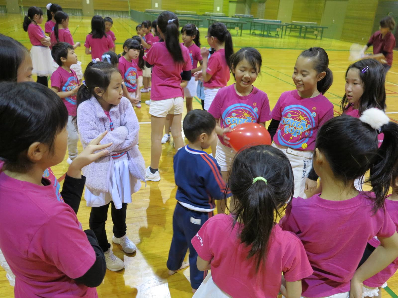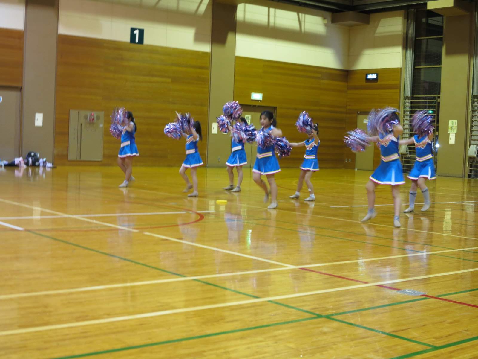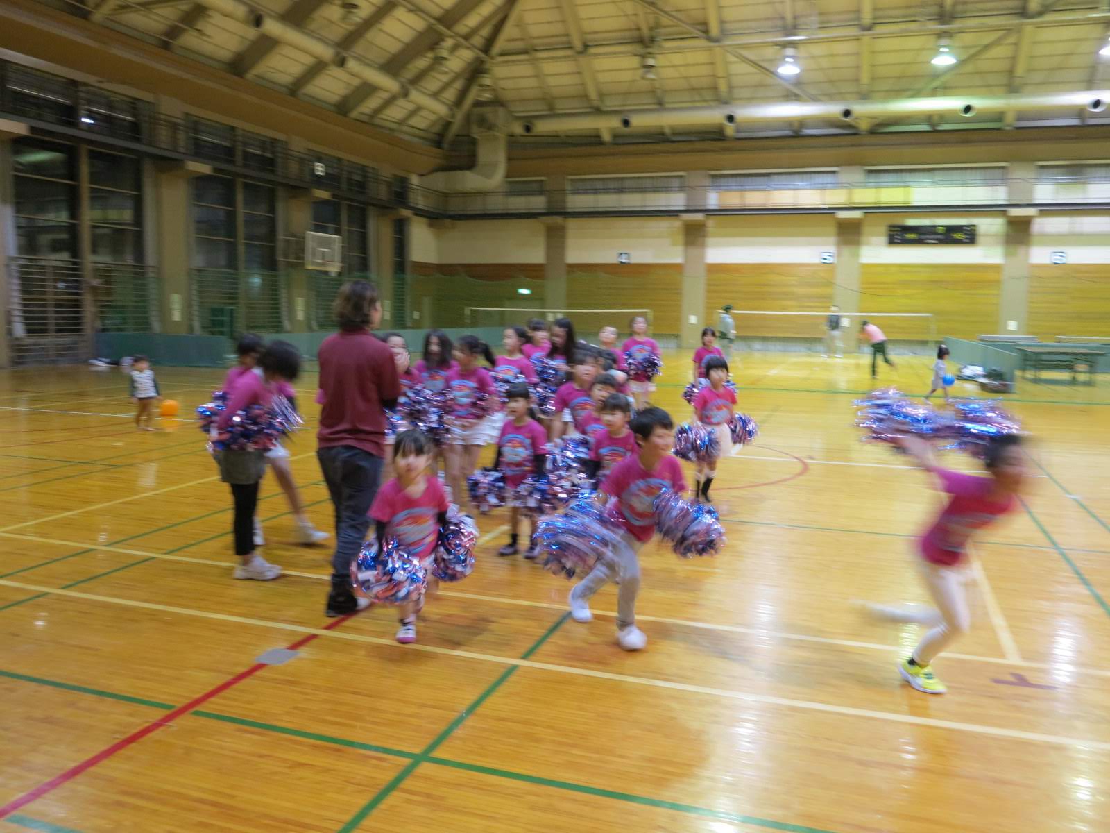 キッズチアダンススクール「candy pop」 。毎回レッスンに使用している体育館でミニ発表会&レクリエーションを行いました。木曜日クラスには小さな助っ人たちが。金曜日クラスは少し大人なパーティーチューンをBGMに。