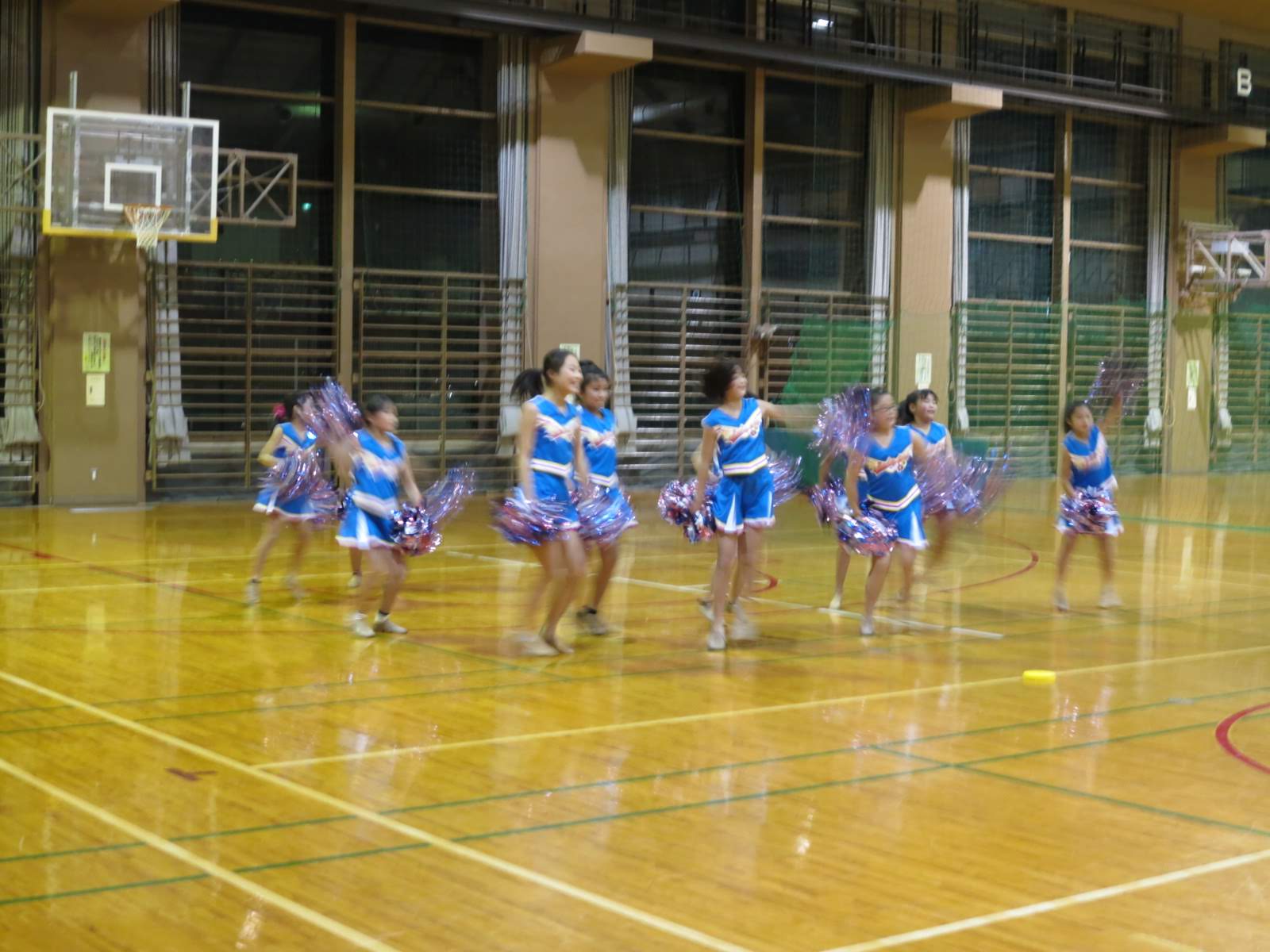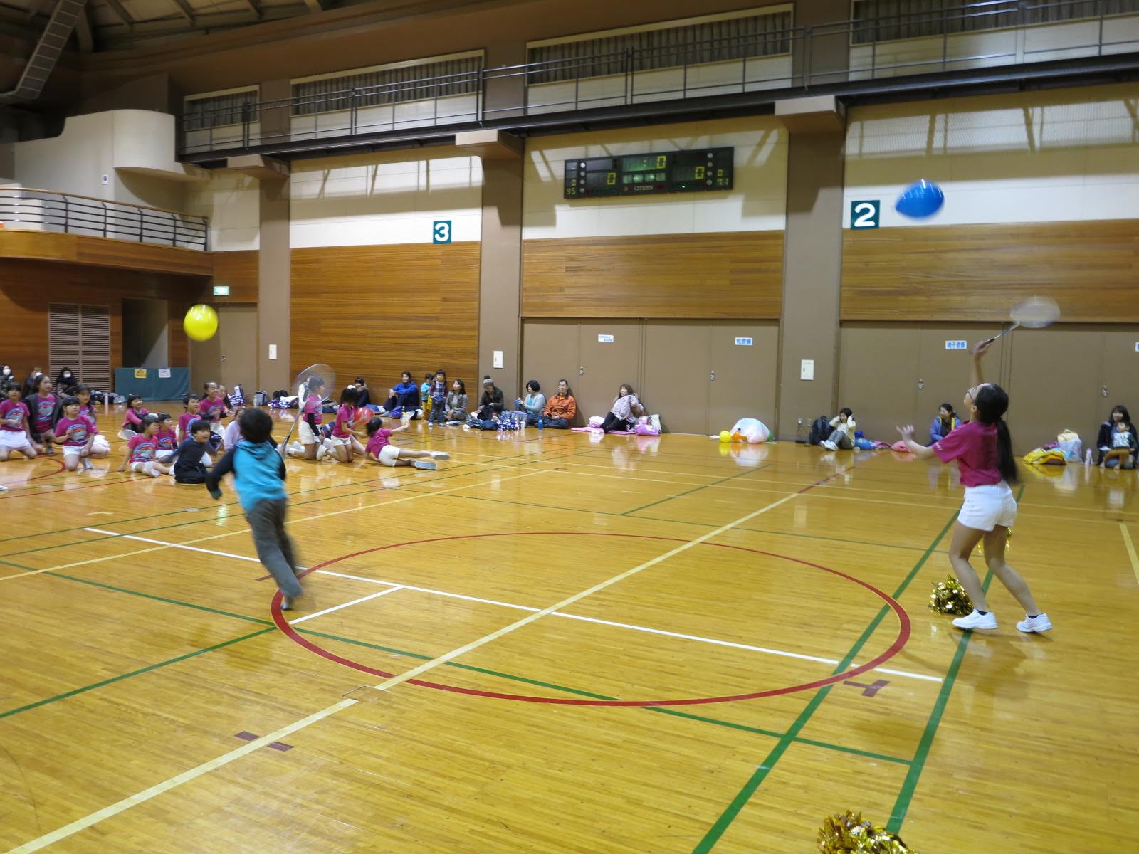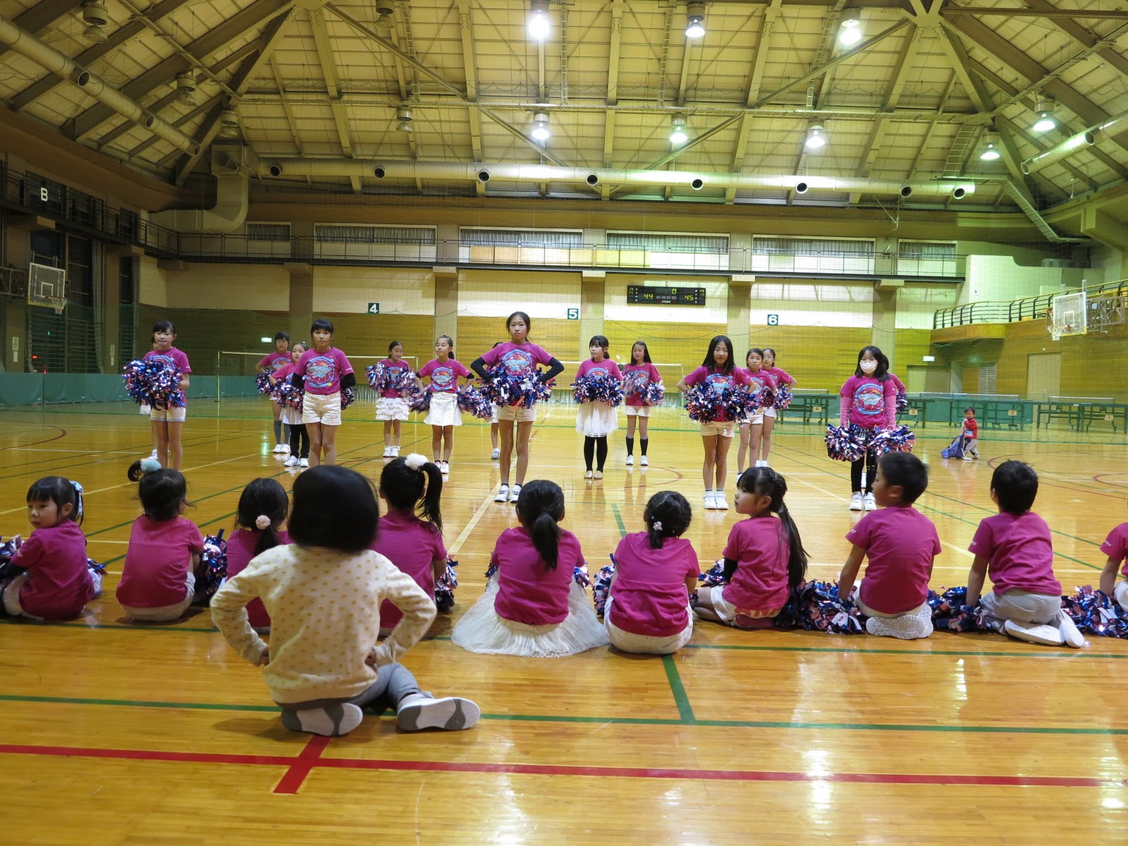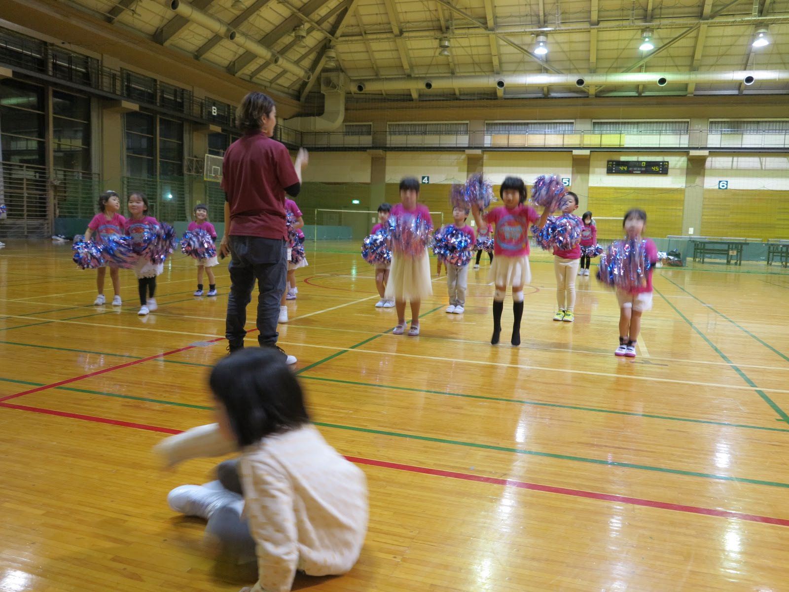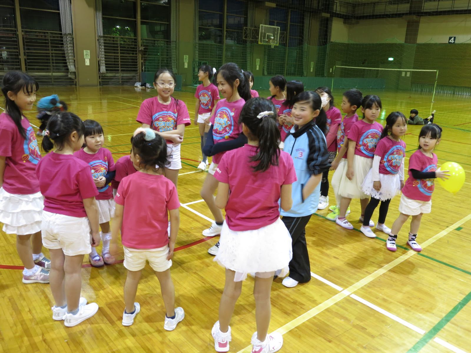 キッズチアダンススクール「candy pop」 。毎回レッスンに使用している体育館でミニ発表会&レクリエーションを行いました。木曜日クラスには小さな助っ人たちが。金曜日クラスは少し大人なパーティーチューンをBGMに。