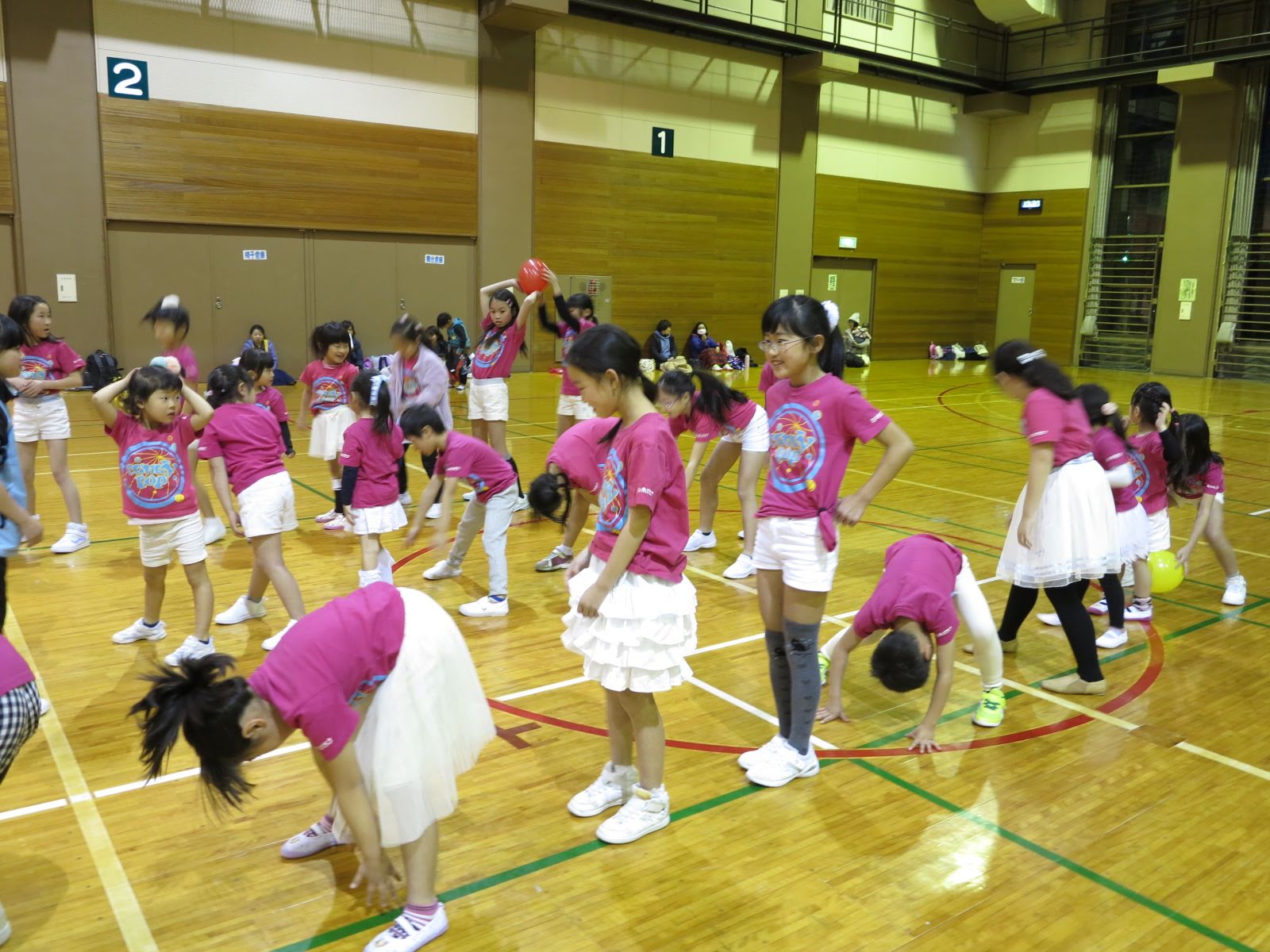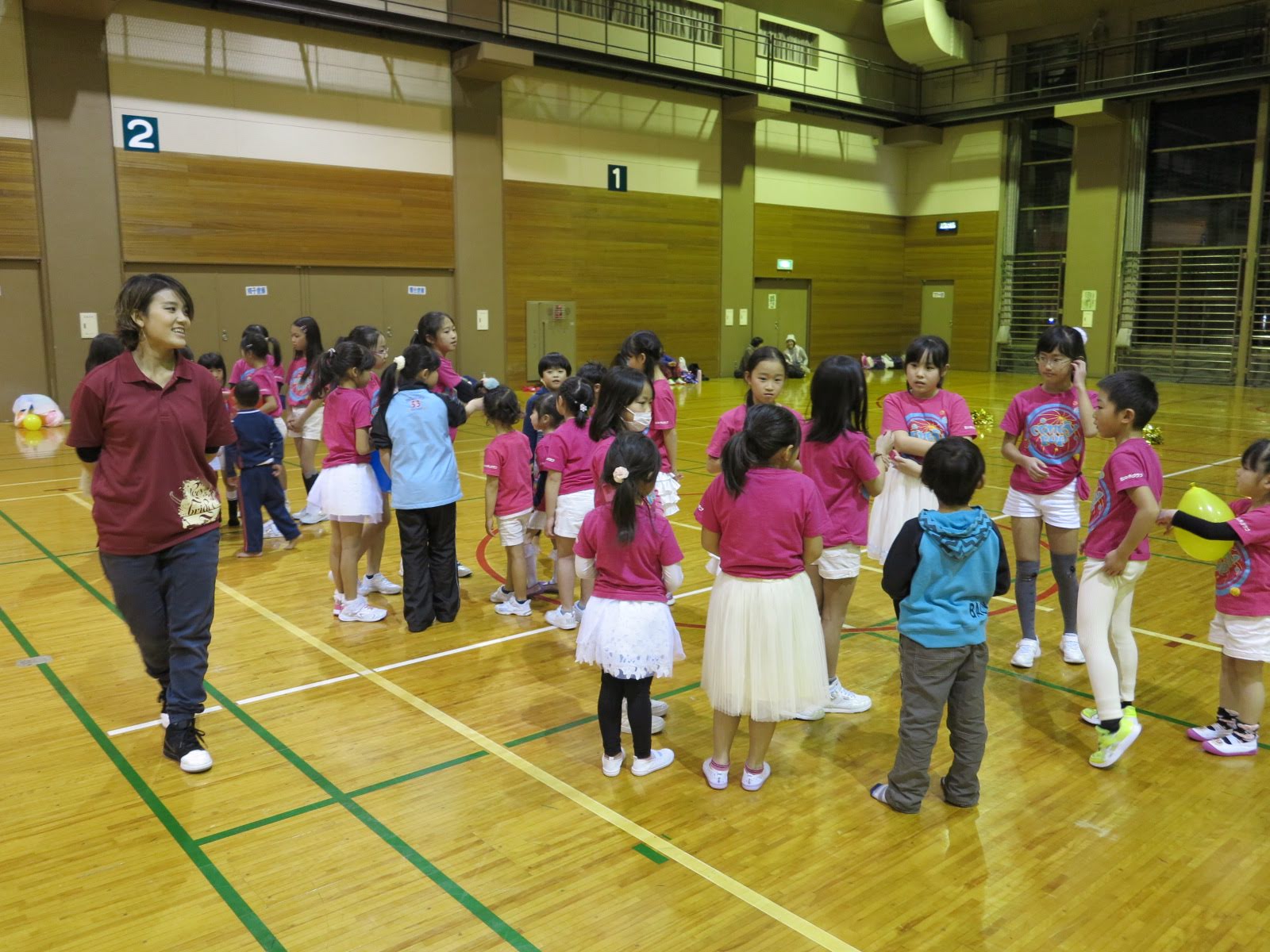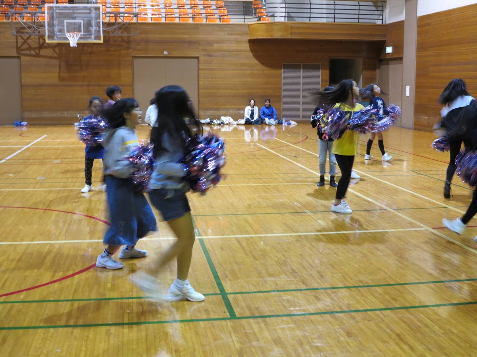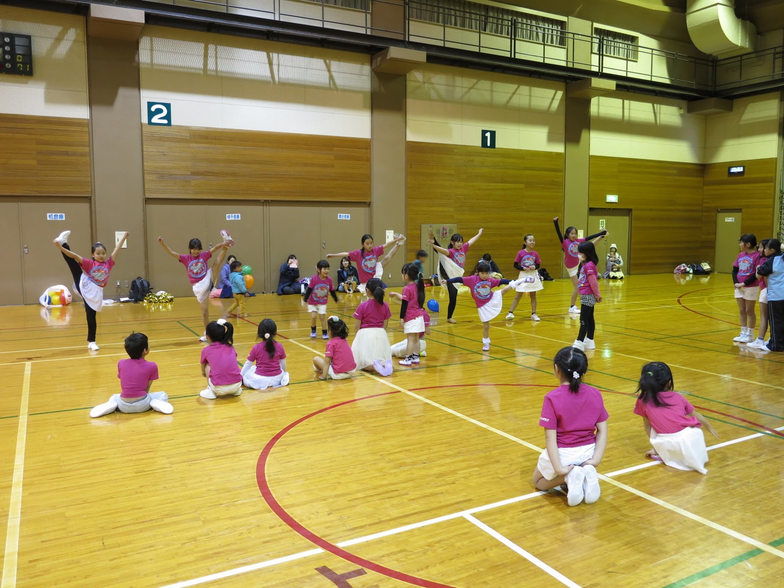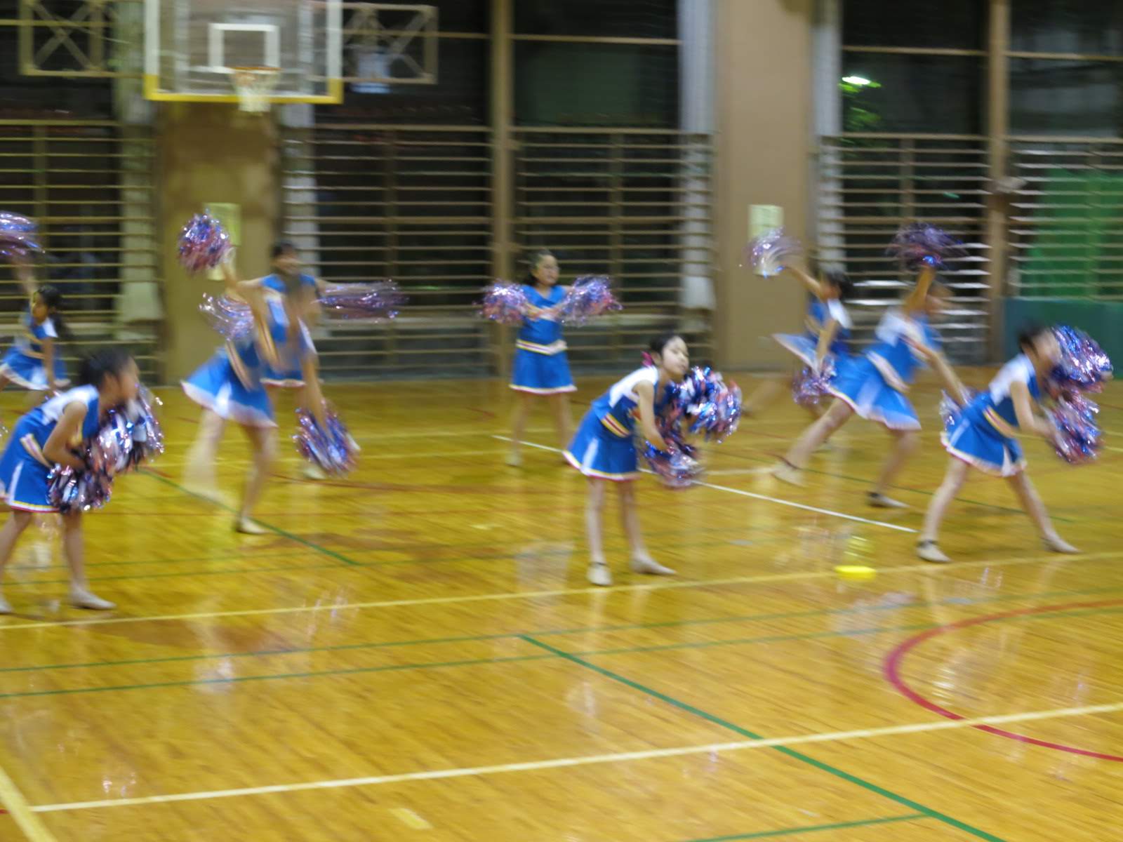 キッズチアダンススクール「candy pop」 。毎回レッスンに使用している体育館でミニ発表会&レクリエーションを行いました。木曜日クラスには小さな助っ人たちが。金曜日クラスは少し大人なパーティーチューンをBGMに。