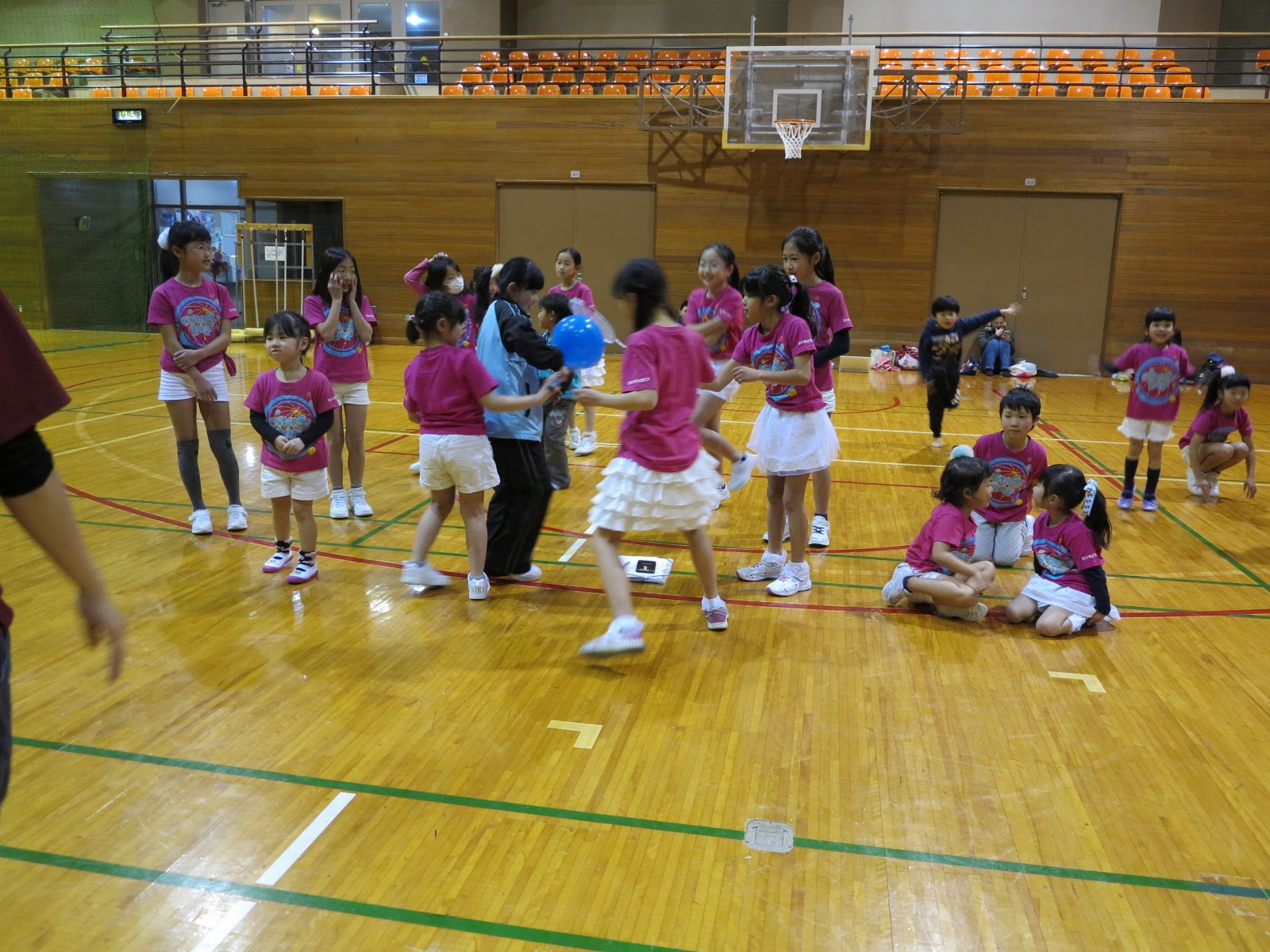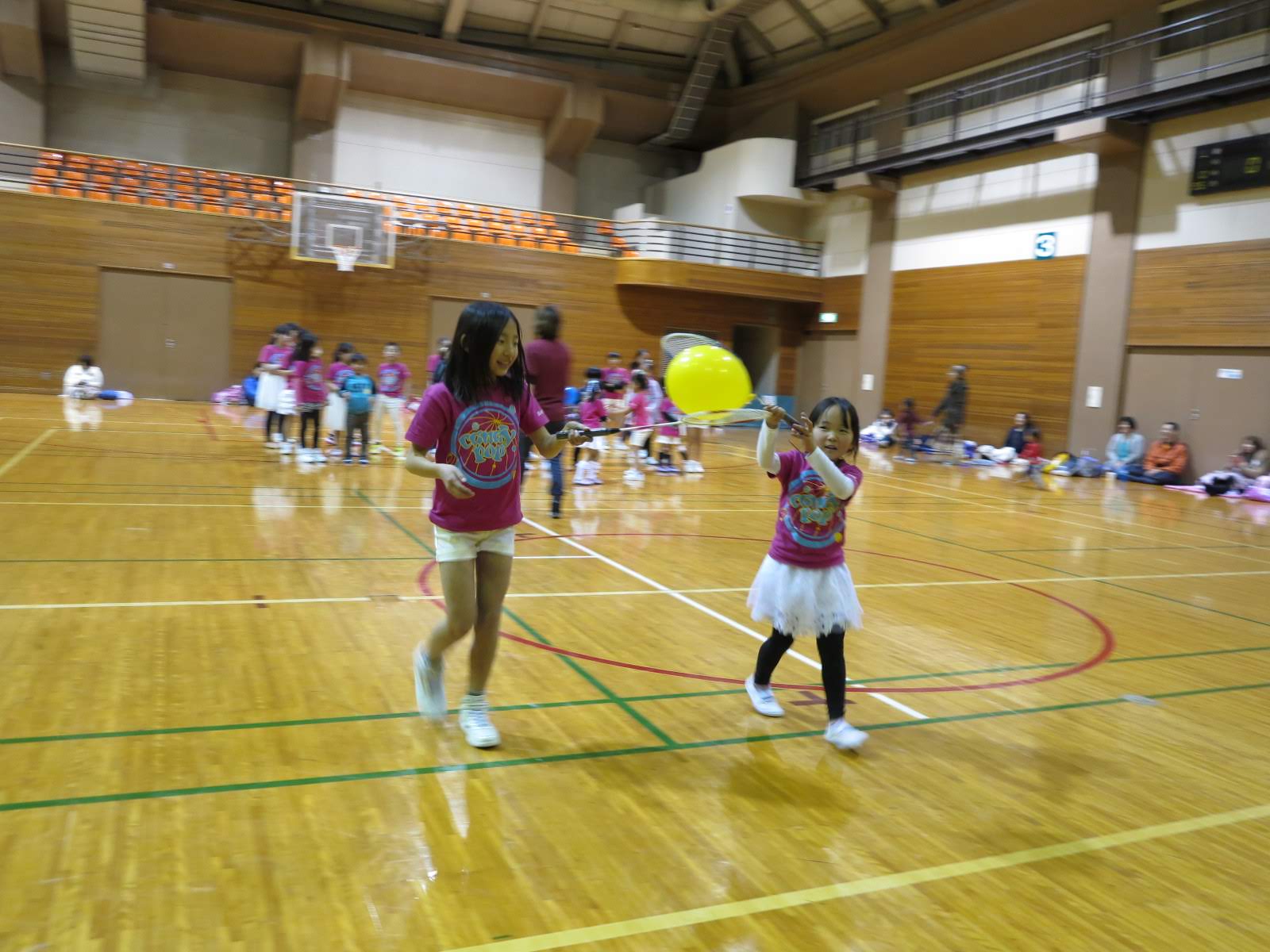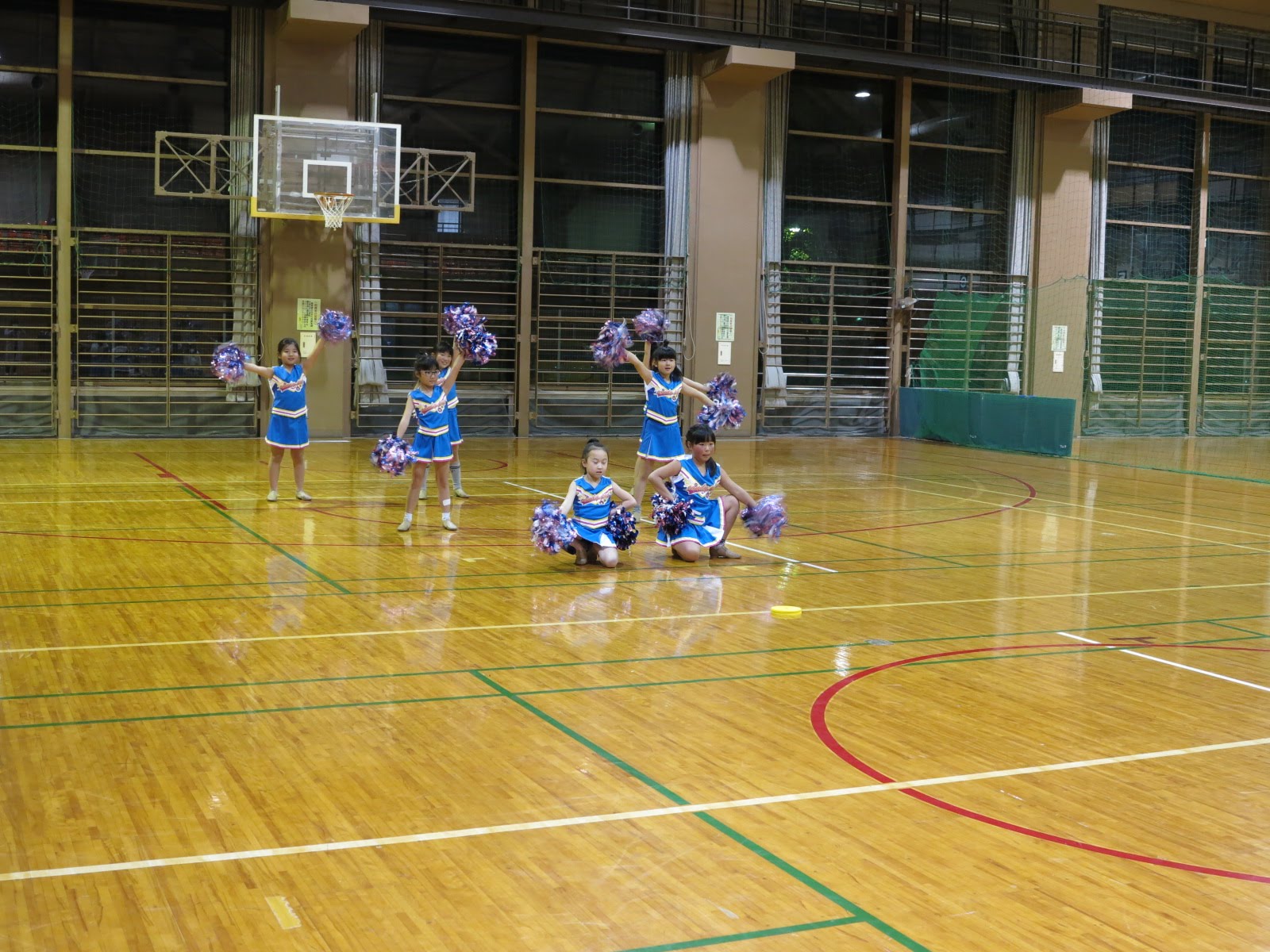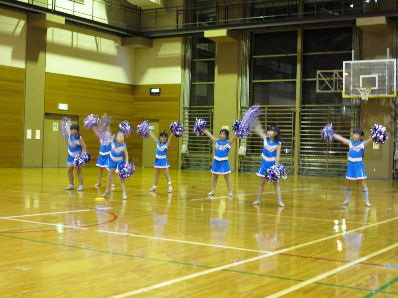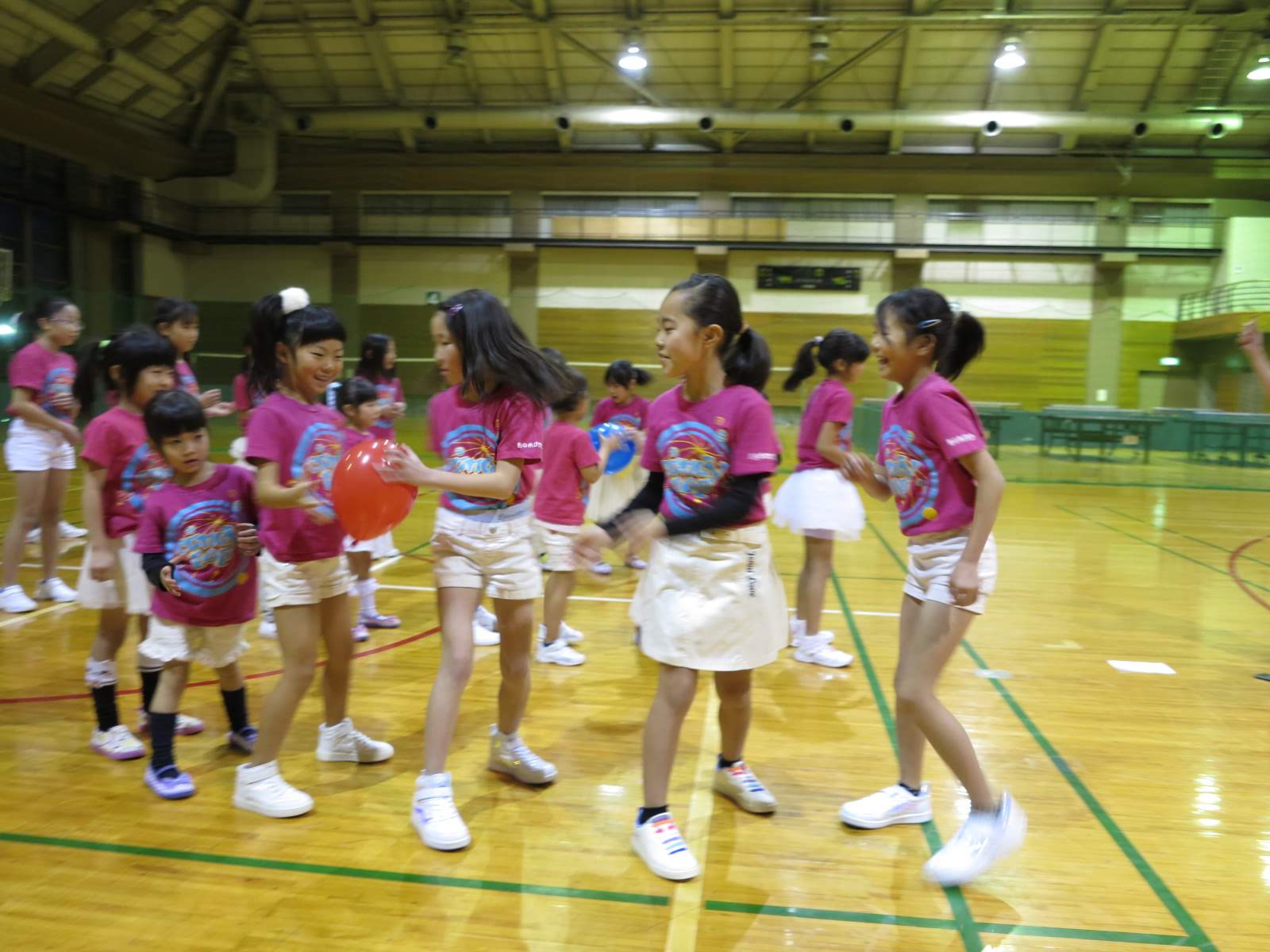 キッズチアダンススクール「candy pop」 。毎回レッスンに使用している体育館でミニ発表会&レクリエーションを行いました。木曜日クラスには小さな助っ人たちが。金曜日クラスは少し大人なパーティーチューンをBGMに。