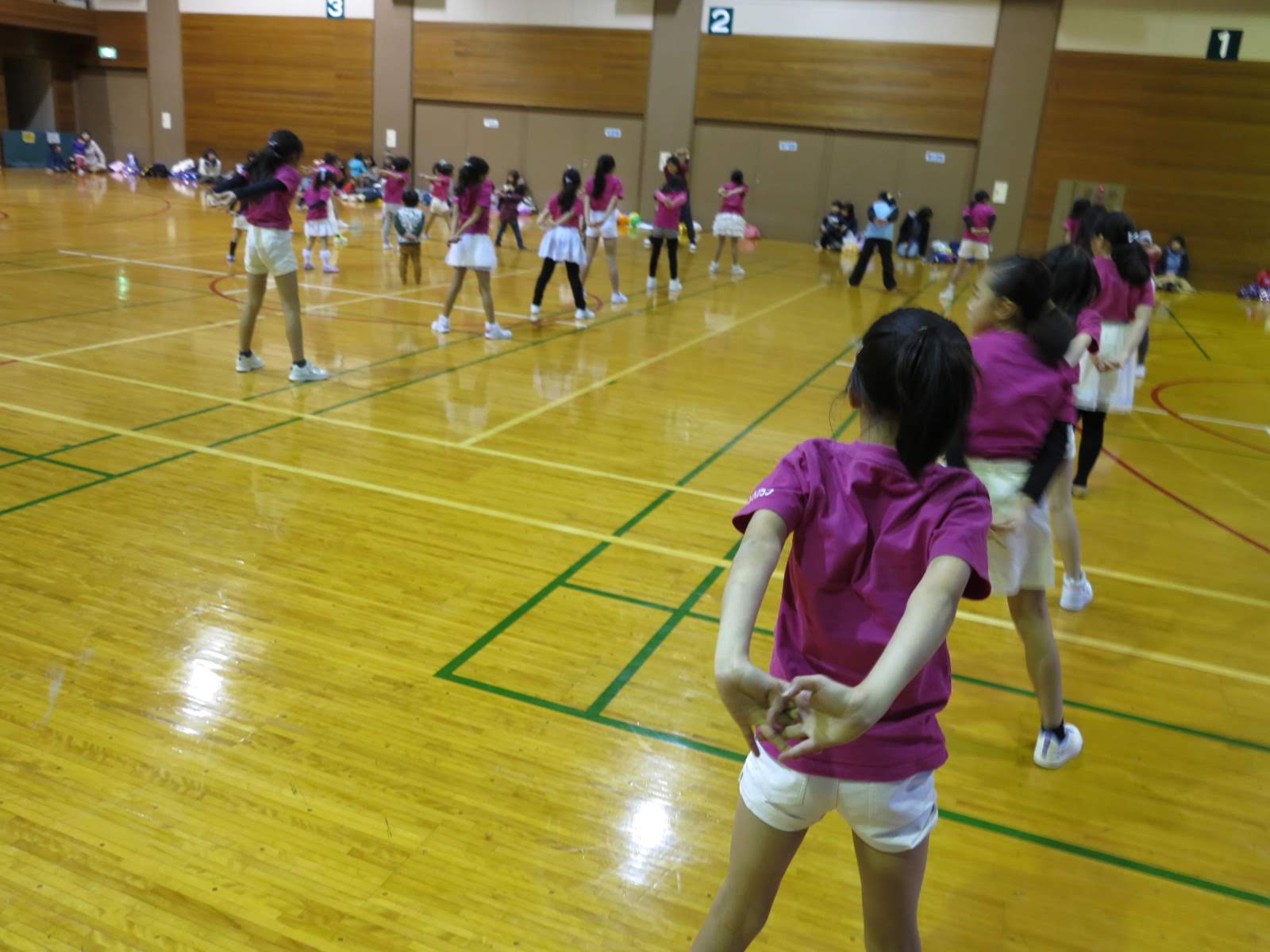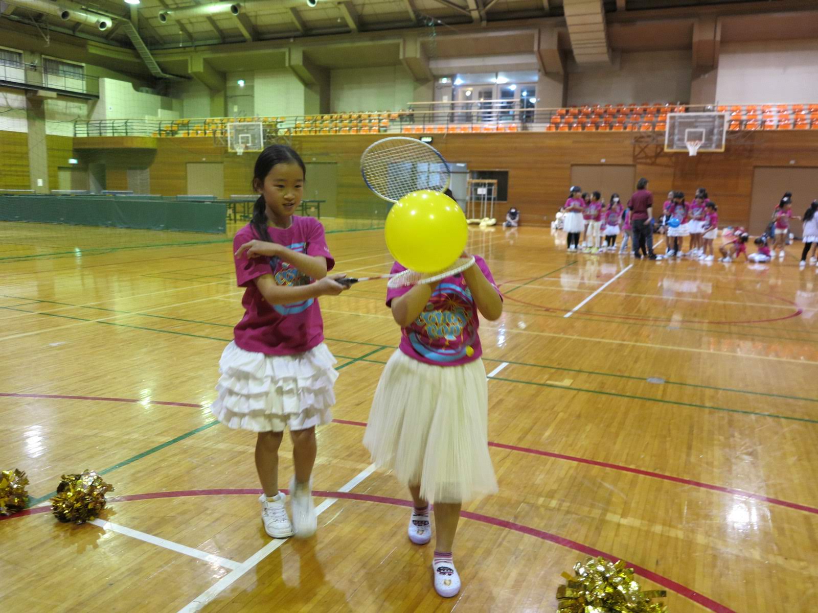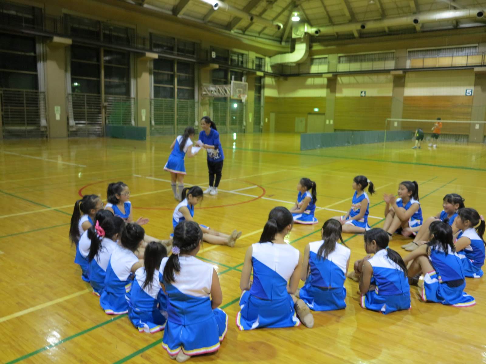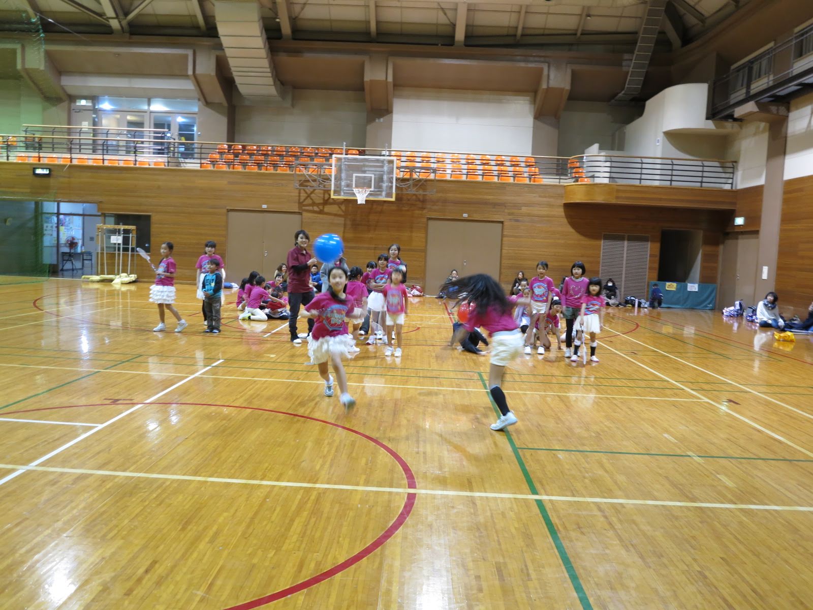 キッズチアダンススクール「candy pop」 。毎回レッスンに使用している体育館でミニ発表会&レクリエーションを行いました。木曜日クラスには小さな助っ人たちが。金曜日クラスは少し大人なパーティーチューンをBGMに。