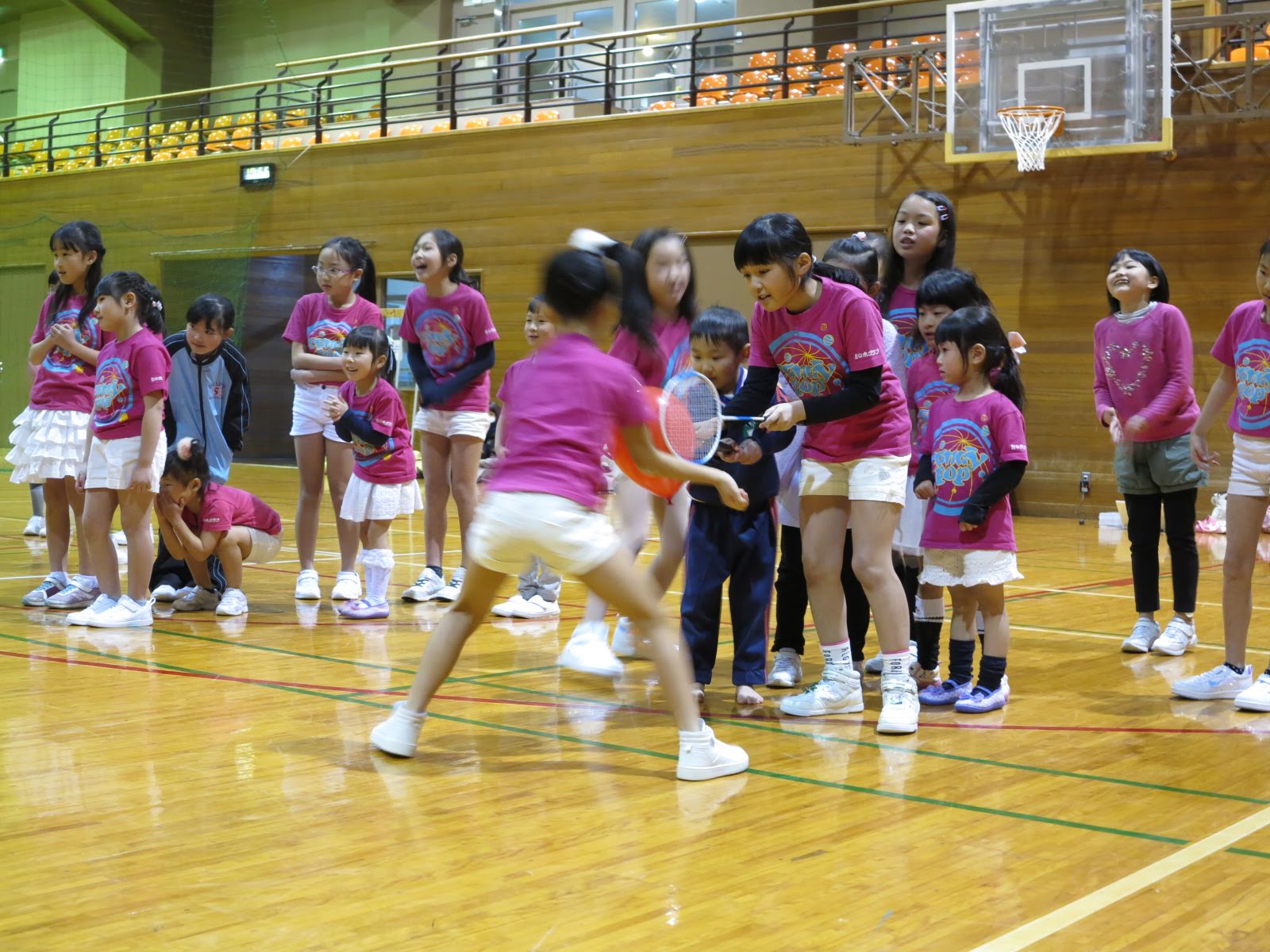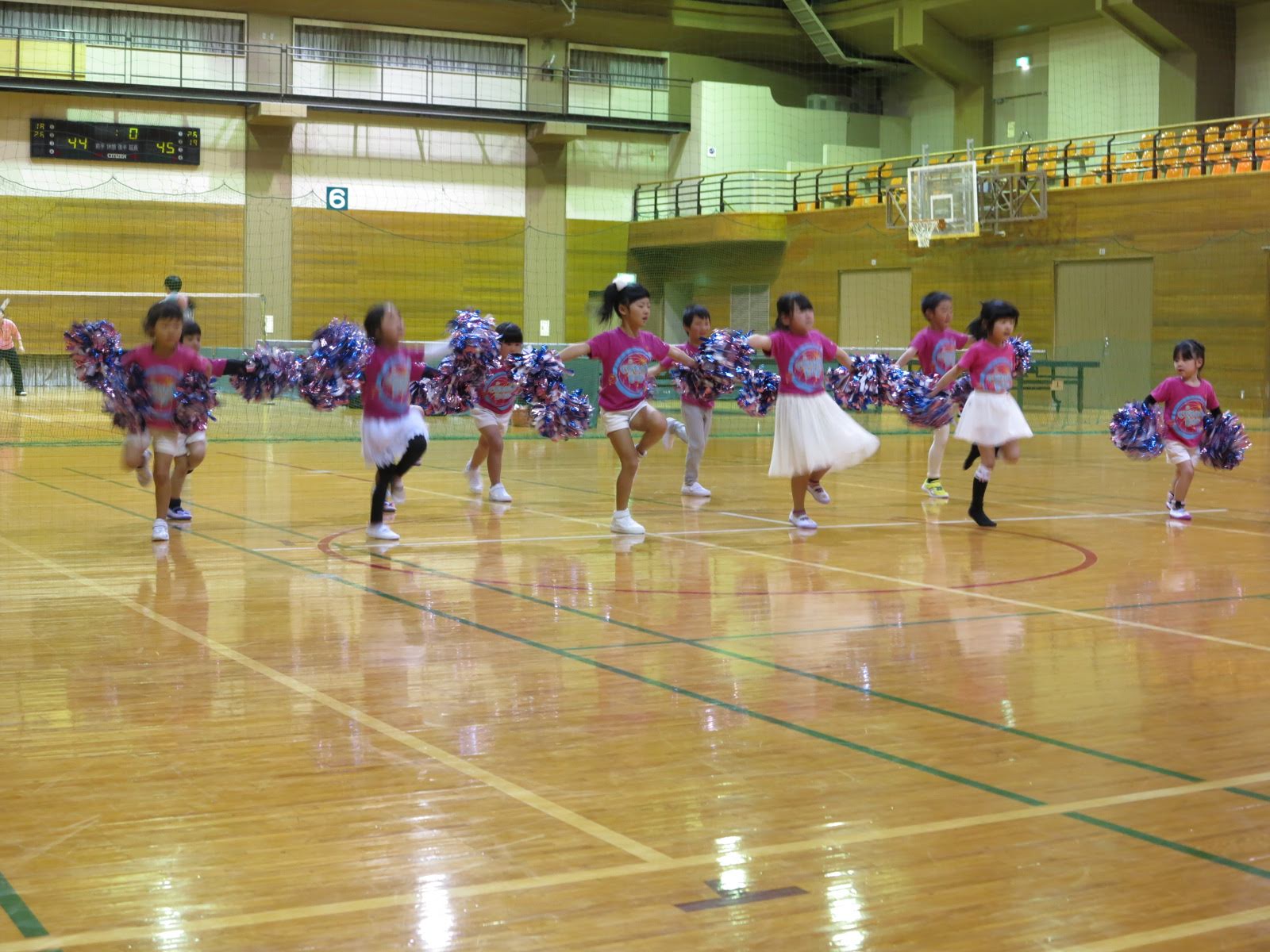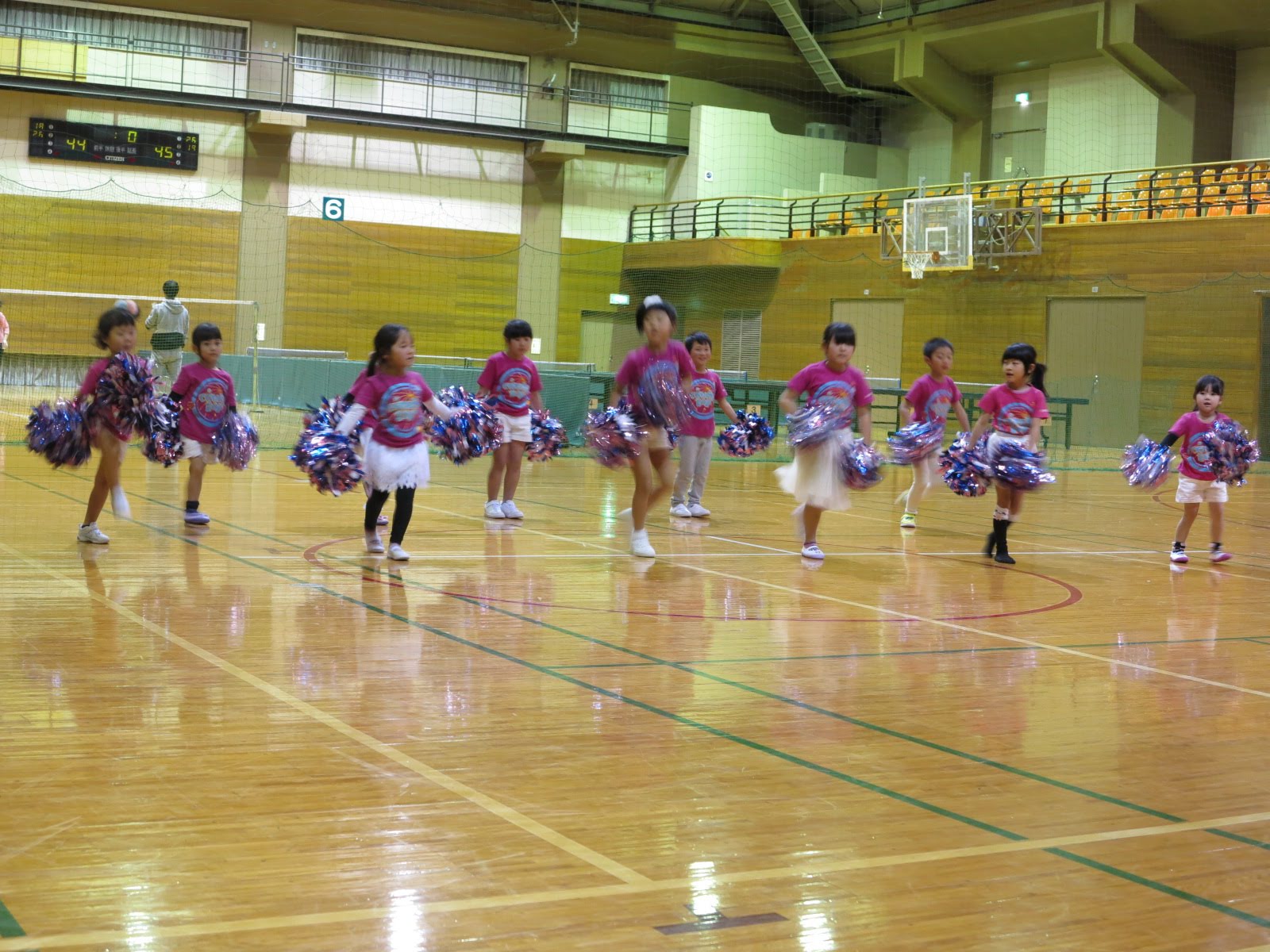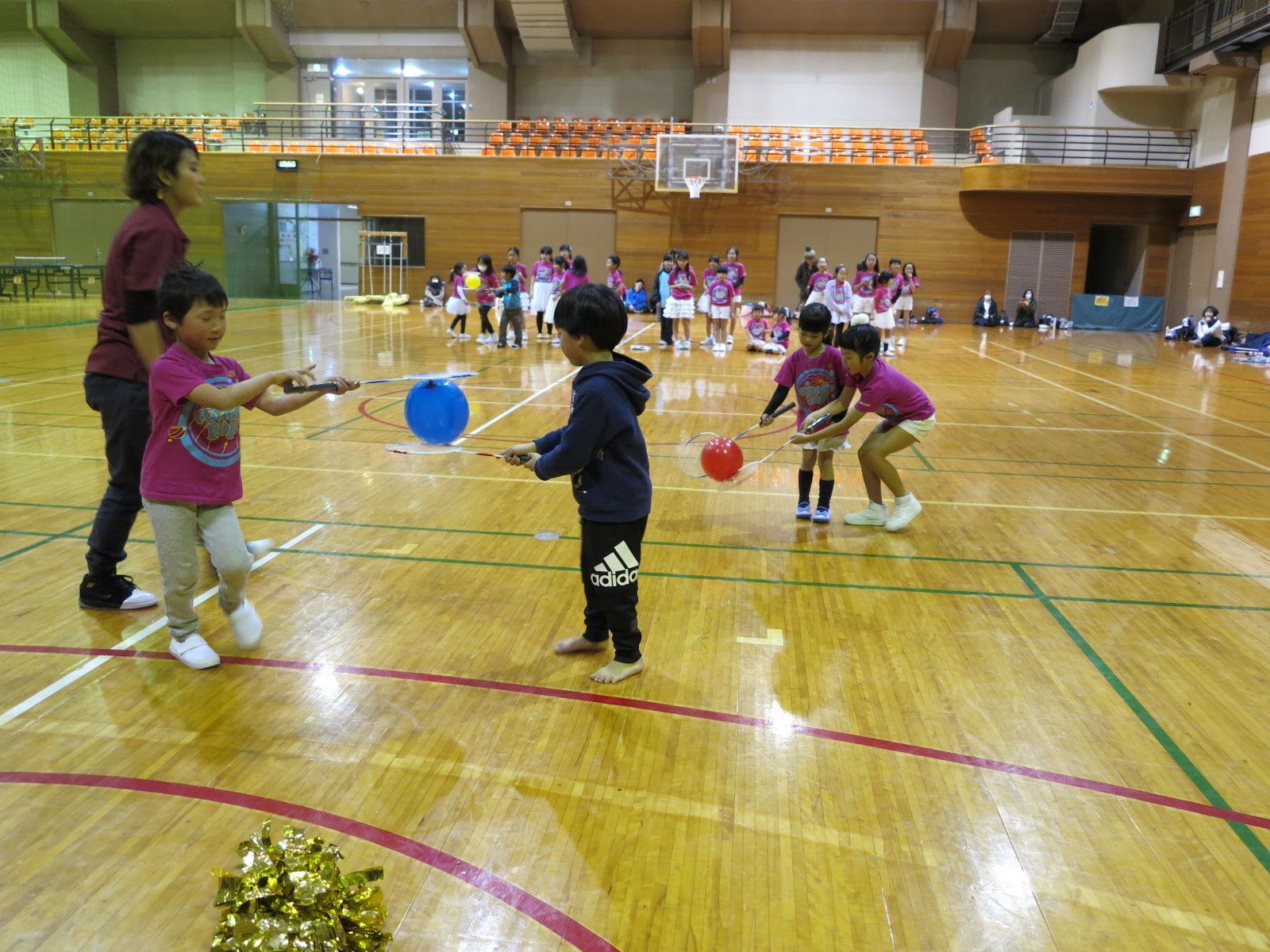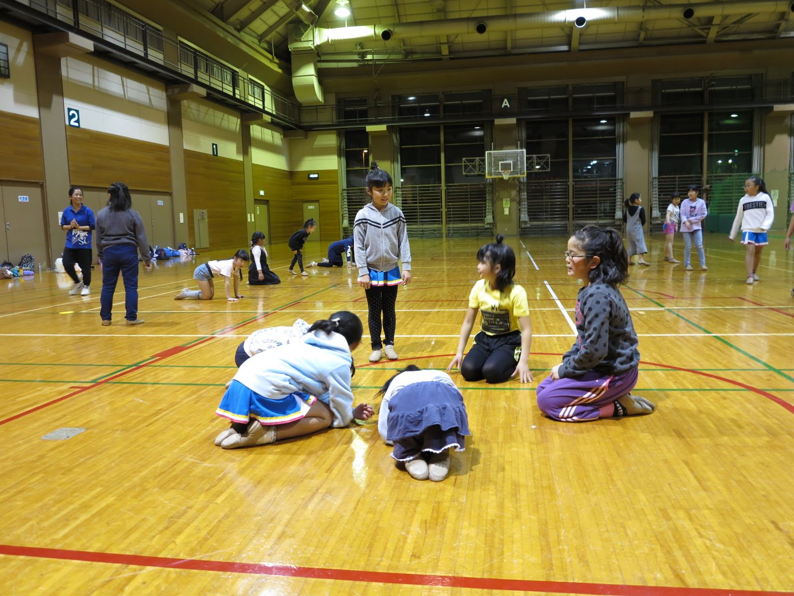 キッズチアダンススクール「candy pop」 。毎回レッスンに使用している体育館でミニ発表会&レクリエーションを行いました。木曜日クラスには小さな助っ人たちが。金曜日クラスは少し大人なパーティーチューンをBGMに。