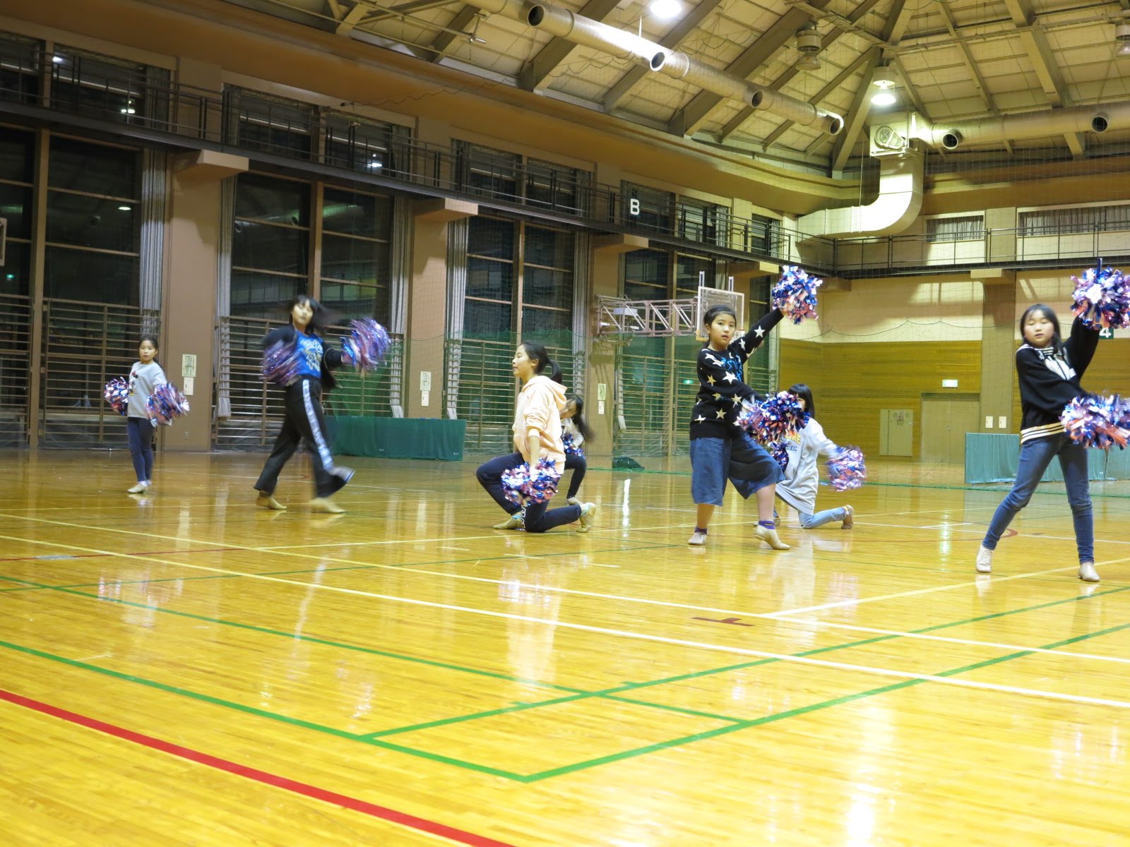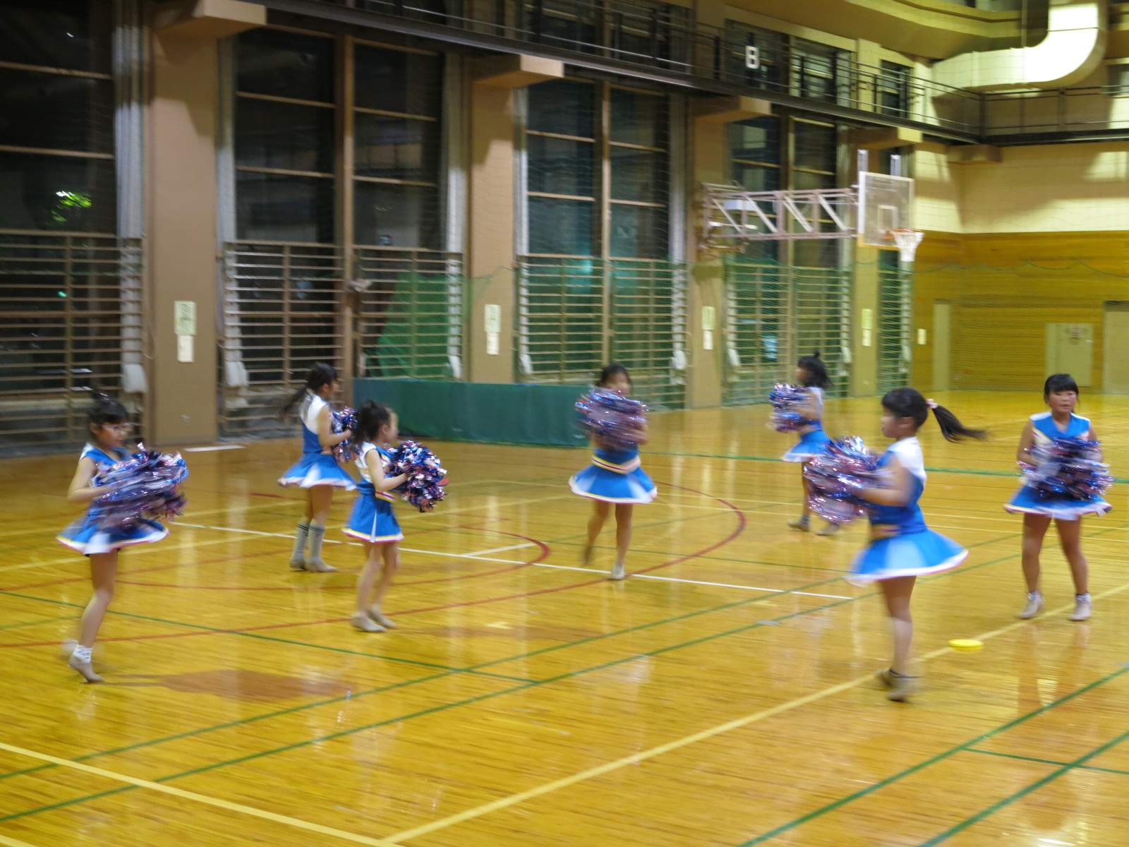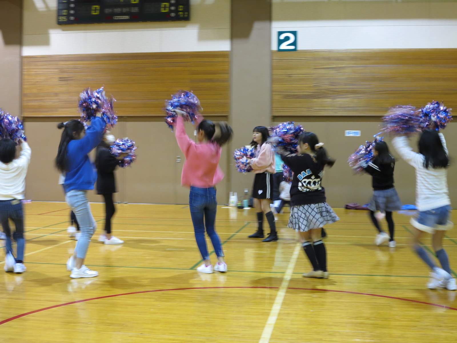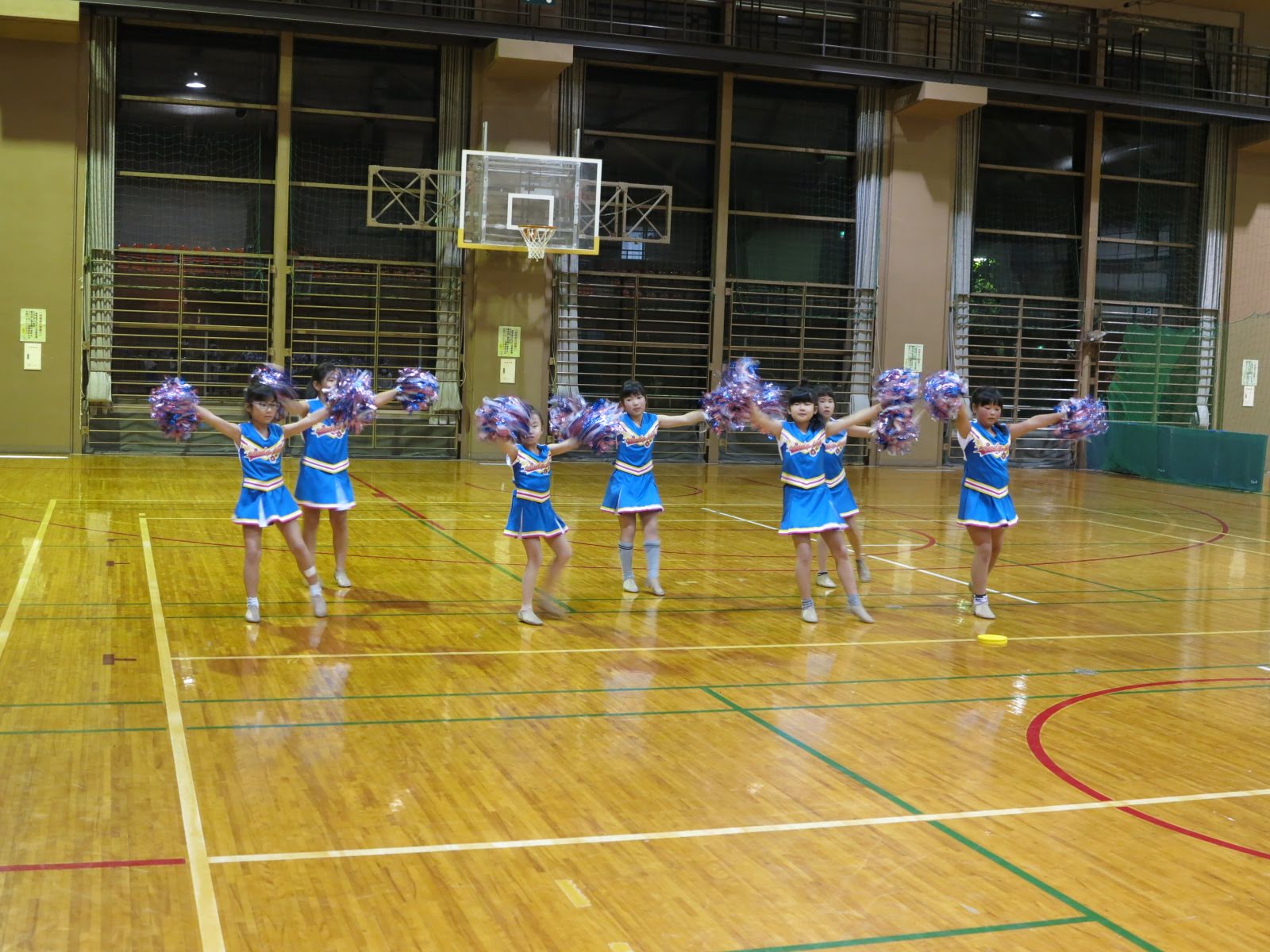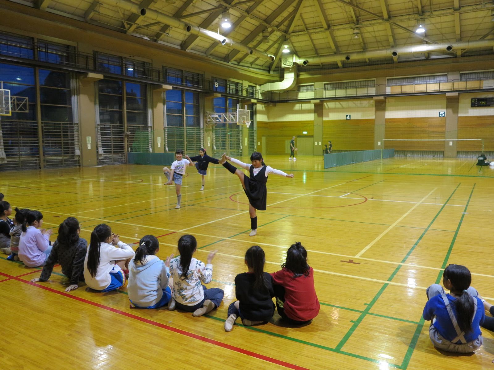 キッズチアダンススクール「candy pop」 。毎回レッスンに使用している体育館でミニ発表会&レクリエーションを行いました。木曜日クラスには小さな助っ人たちが。金曜日クラスは少し大人なパーティーチューンをBGMに。
