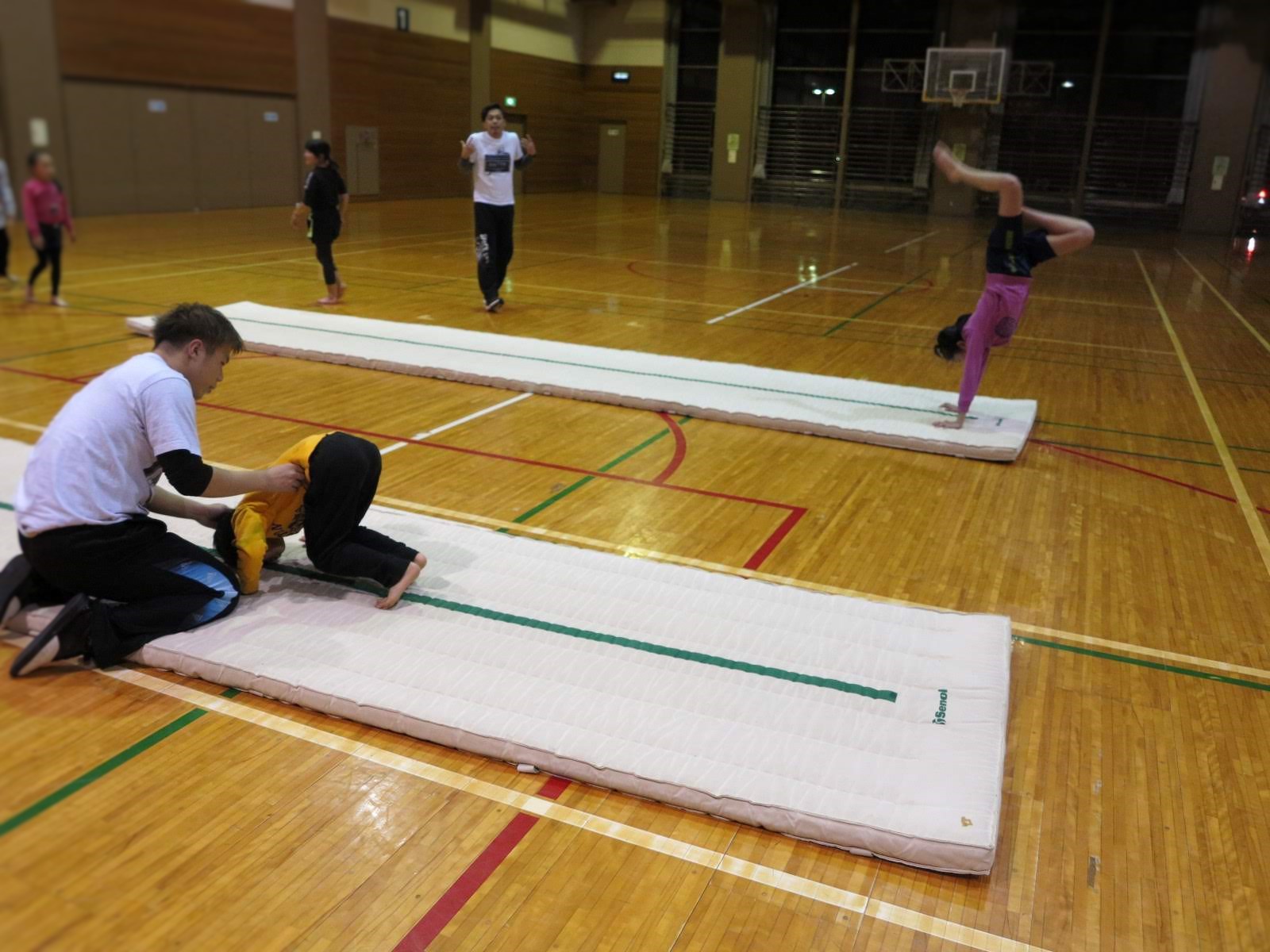 前転・後転・側転などの基本技術から倒立・ブリッジ・タンブリングなどの応用技術まで幅広く指導します。また、けがをしない丈夫な身体つくりを目指します。