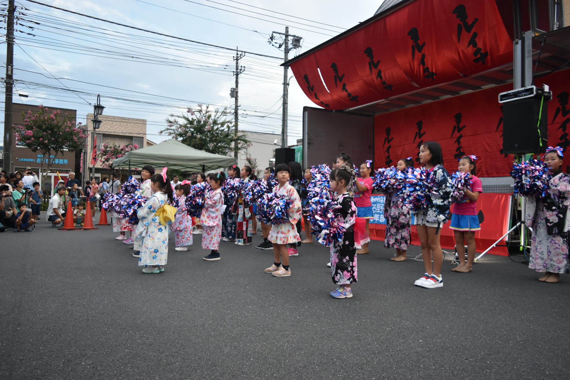 五日市の夜の街で行われるヨルイチ。その中のステージにあきる野夏祭り同様candy popとbreak throughが出演しました。ヨルイチの雰囲気に合わせて普段の衣装とは一味違う『和装』でパフォーマンスを行い、会場を盛り上げました。break throughはステージに上がり、司会の芸人の方々ともコミュニケーションをとり会場を盛り上げていました。