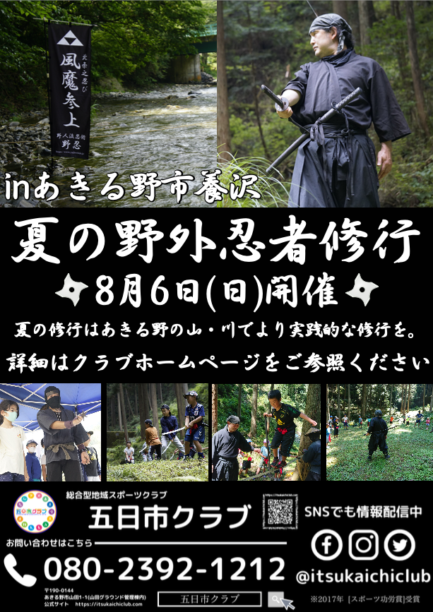 昨年は荒天で開催できませんでしたが、夏の野外忍者教室を開催いたします。