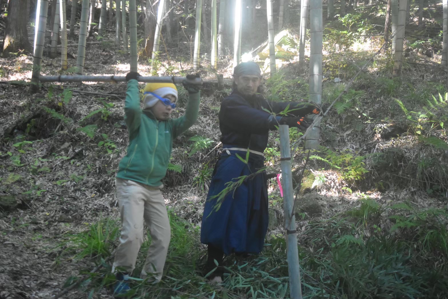 裏山(山の入口の竹林です。夏のイベントの様に、山の奥へは入りません。)を歩き、竹を扱います。
